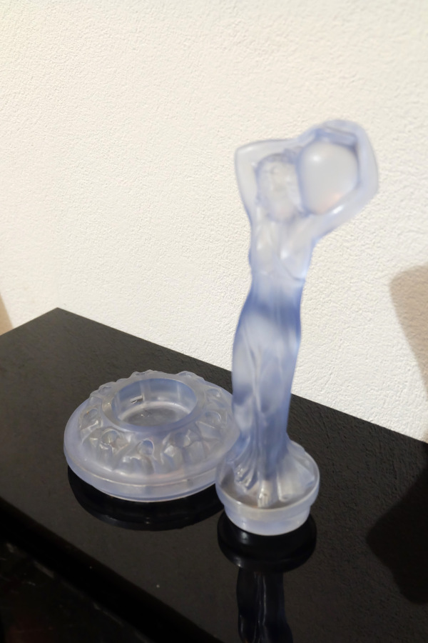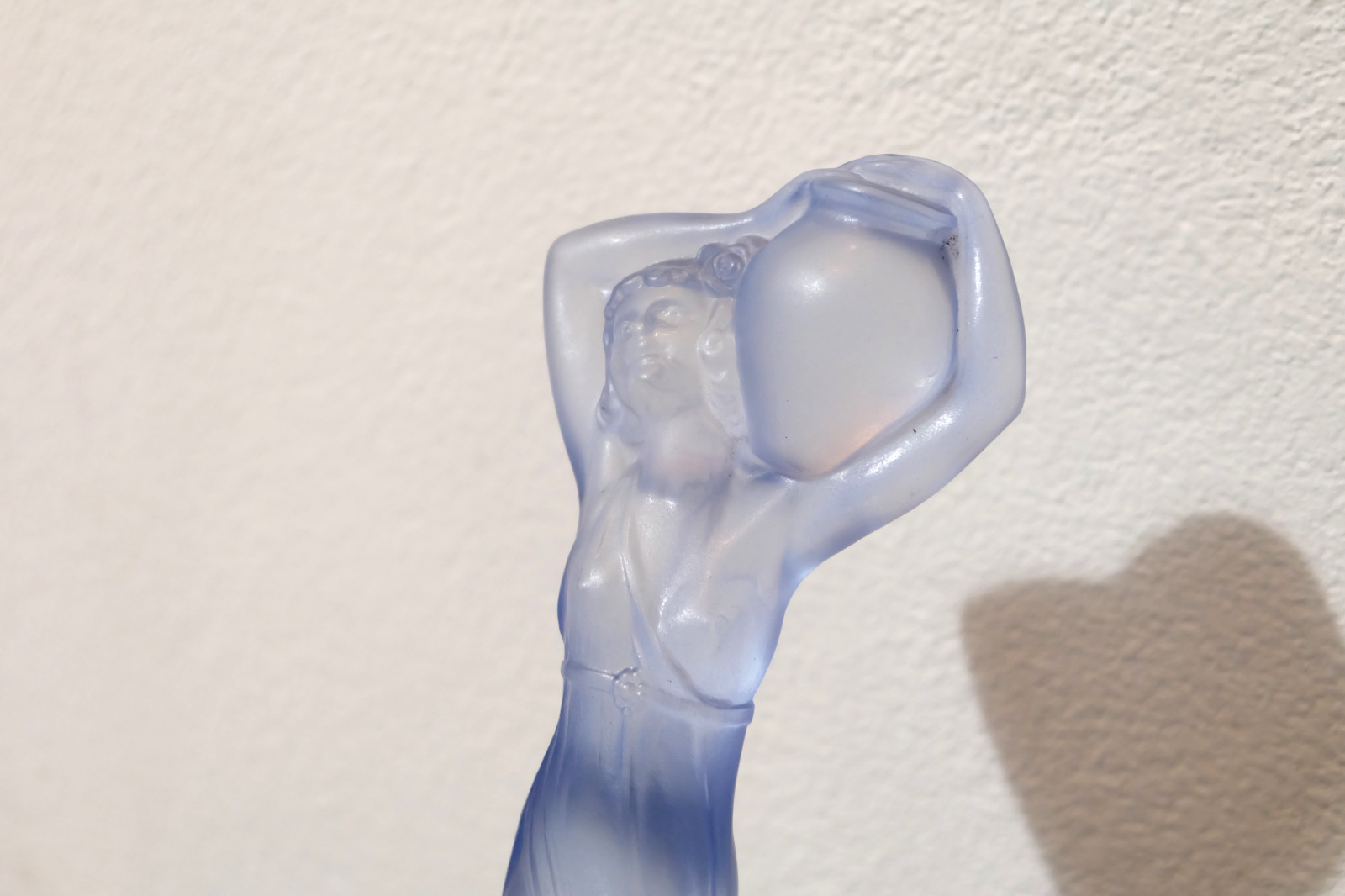Sporo odetá dievčina nesúca džbán z číreho modrého skla, stojí na fazetovo brúsenom a leštenom podstavci z hyalitového opakného skla. Figúrka je dielom niektorej z jizerskohorských kryštálérií z prvej polovice minulého storočia do súboru luxusného skla s obchodným názvom INGRID firmy Curt SCHLEVOGT.