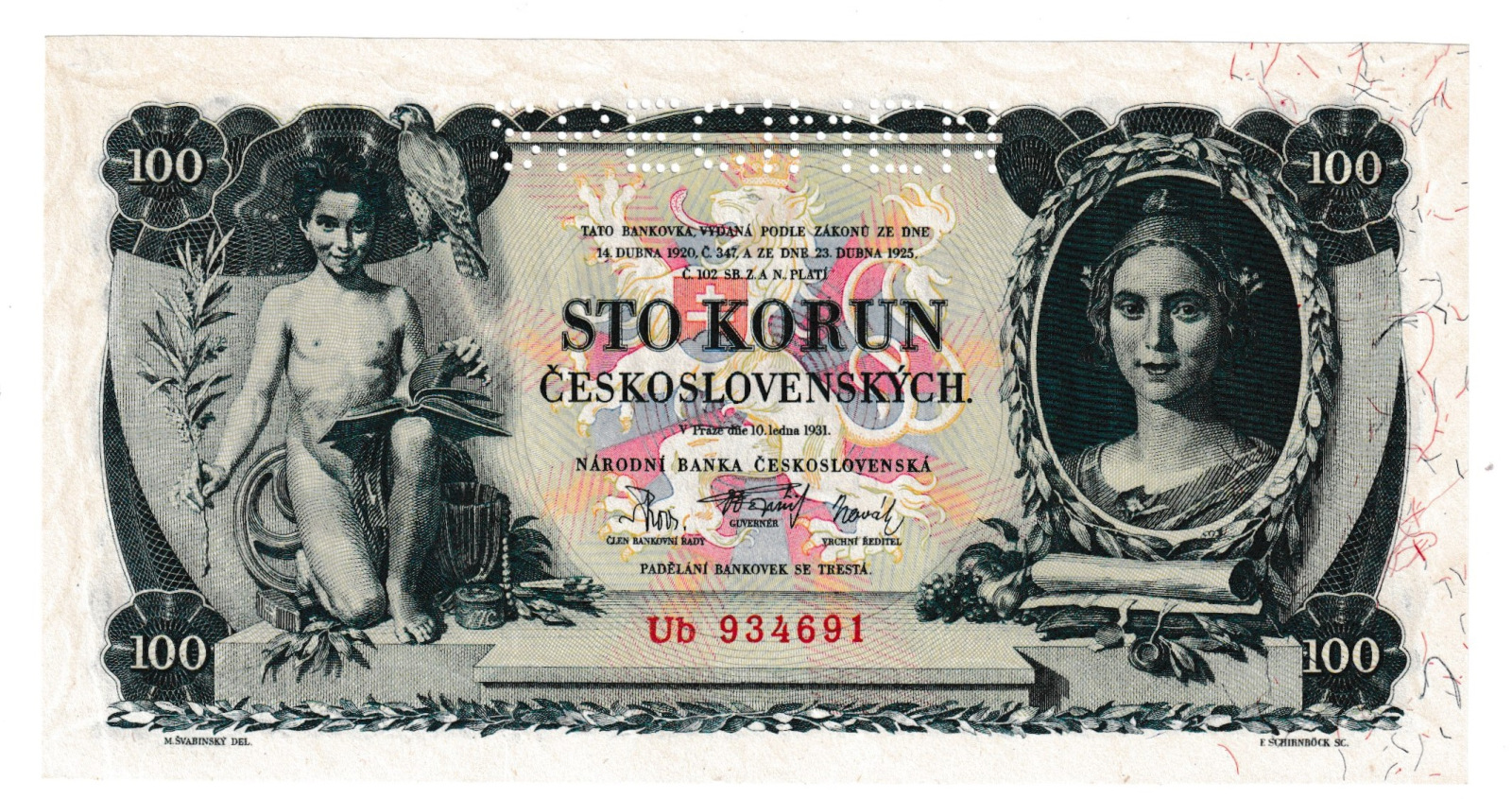 1931 100 kčs séria Ub perforácia Specimen Aunc