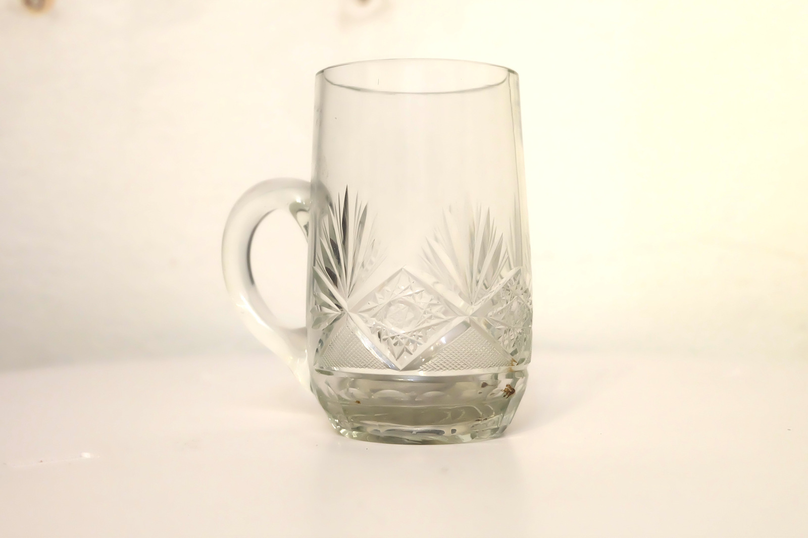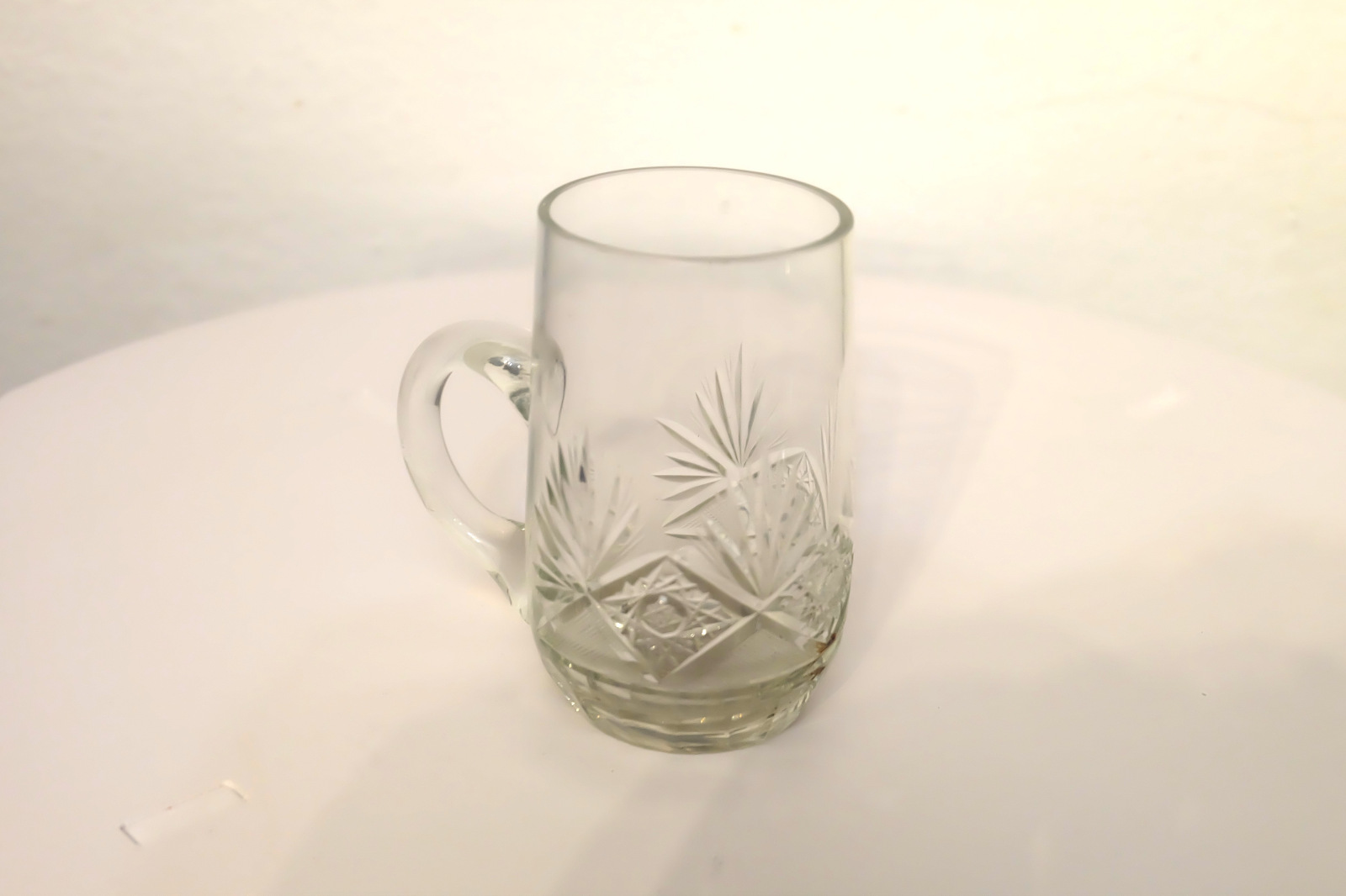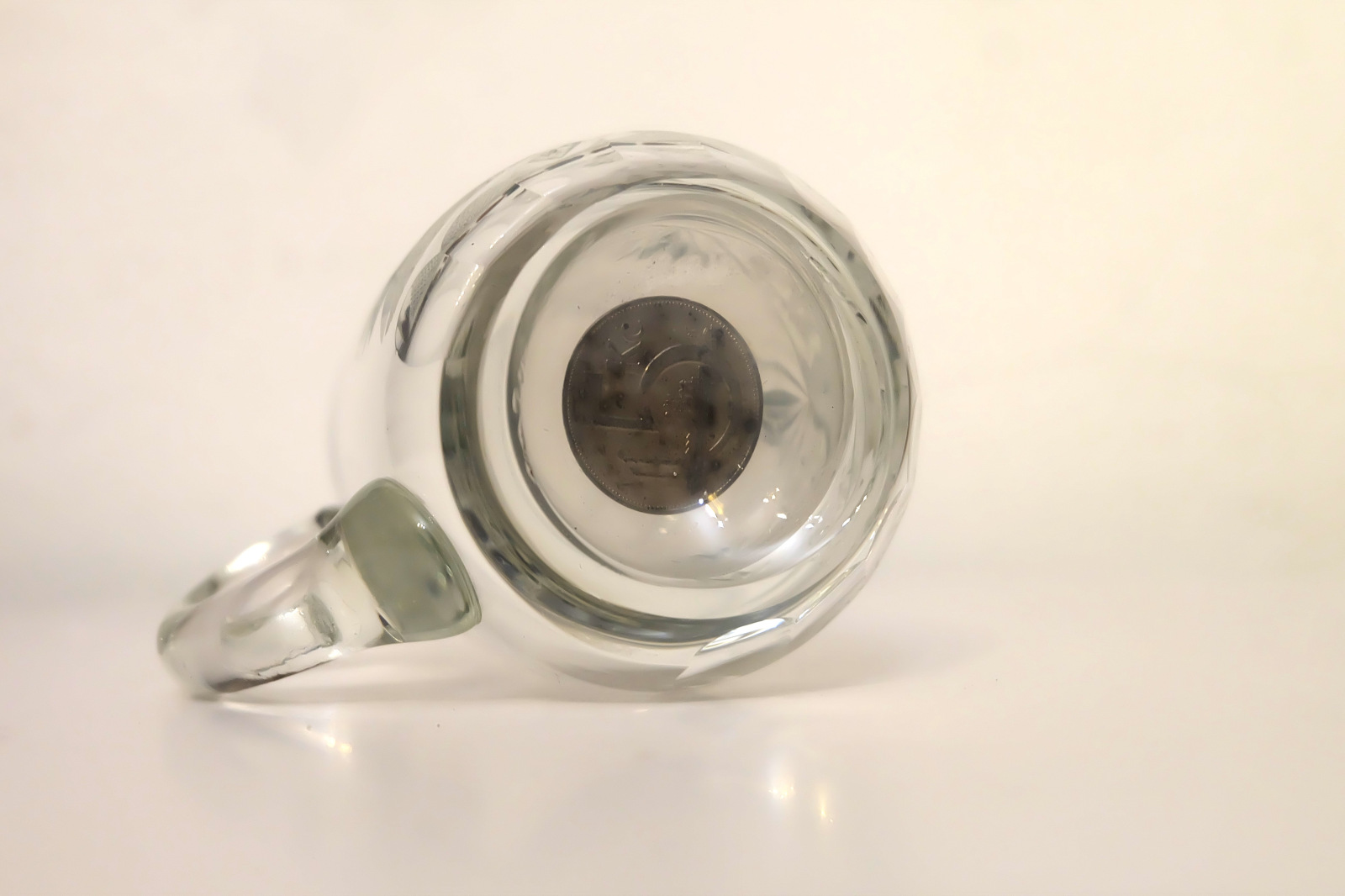 1937 Pohár z bruseného skla zo zaliatou 5 korunou, vyrobené a vybrúsené v sklárňach Lednické Rovné.