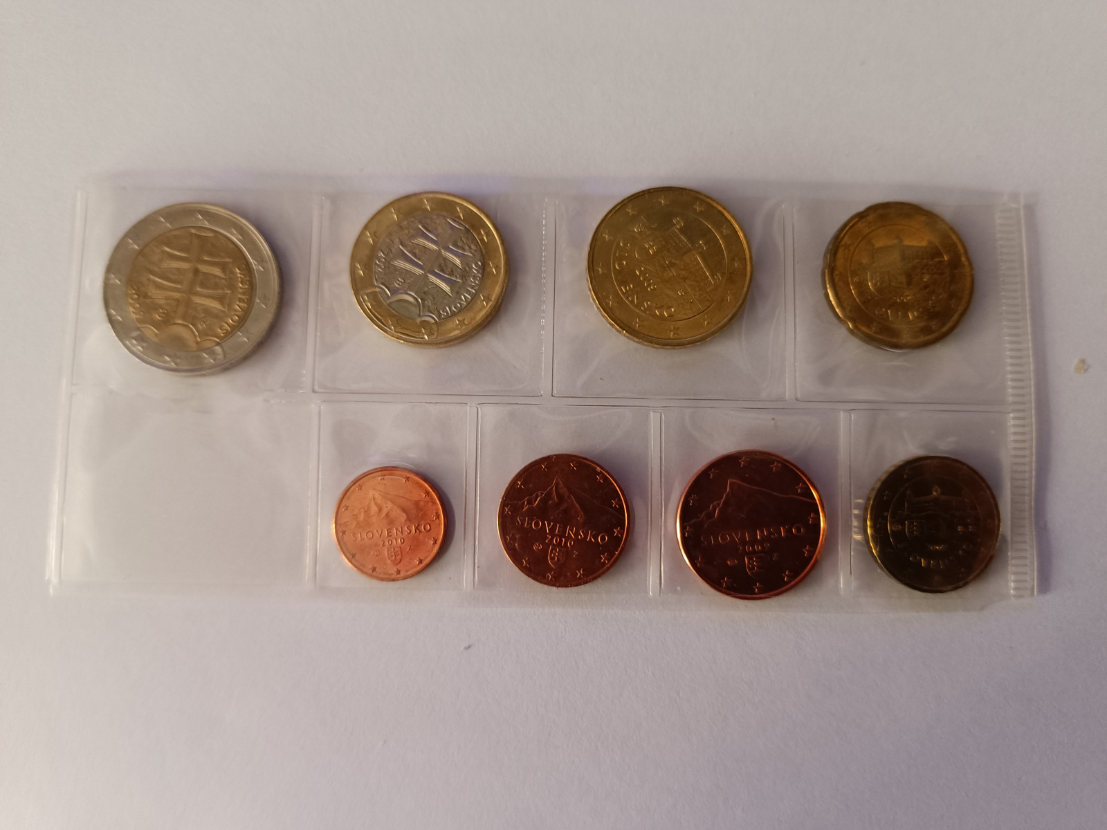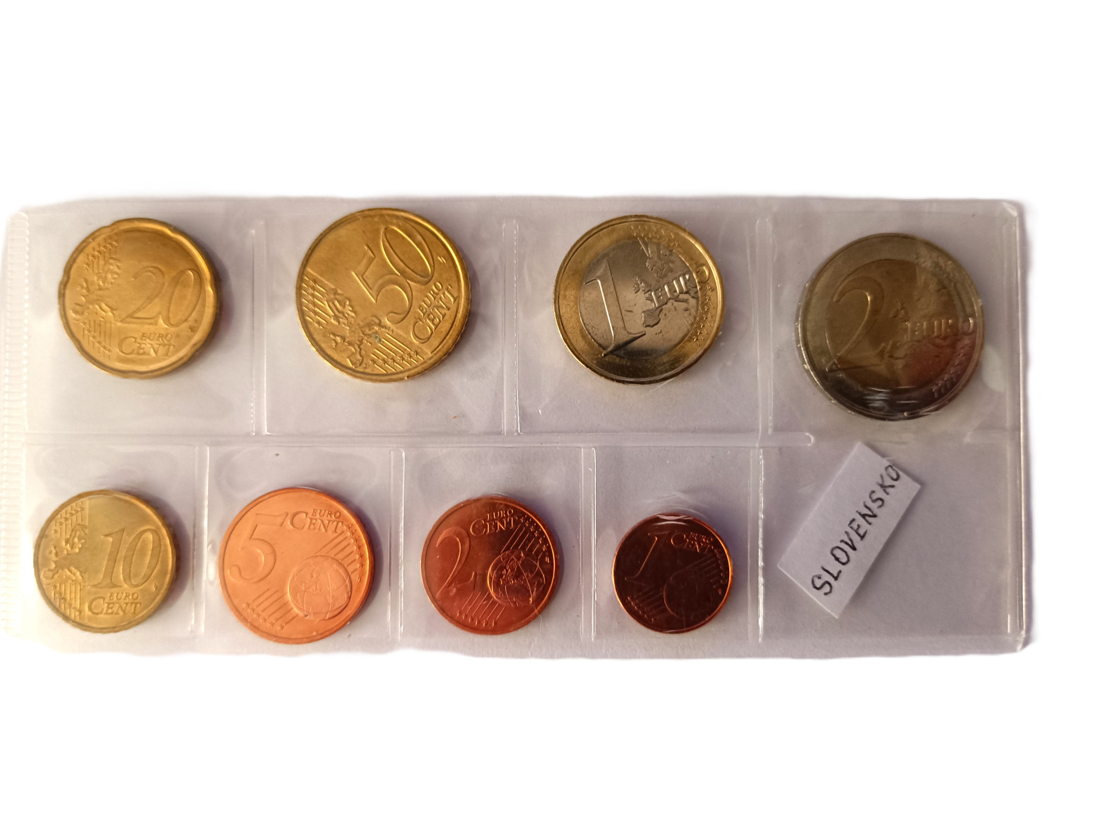 Set obsahuje 2 euro 1 euro 50 cent 20 cent 10 cent 5 cent 2 cent a 1 cent.