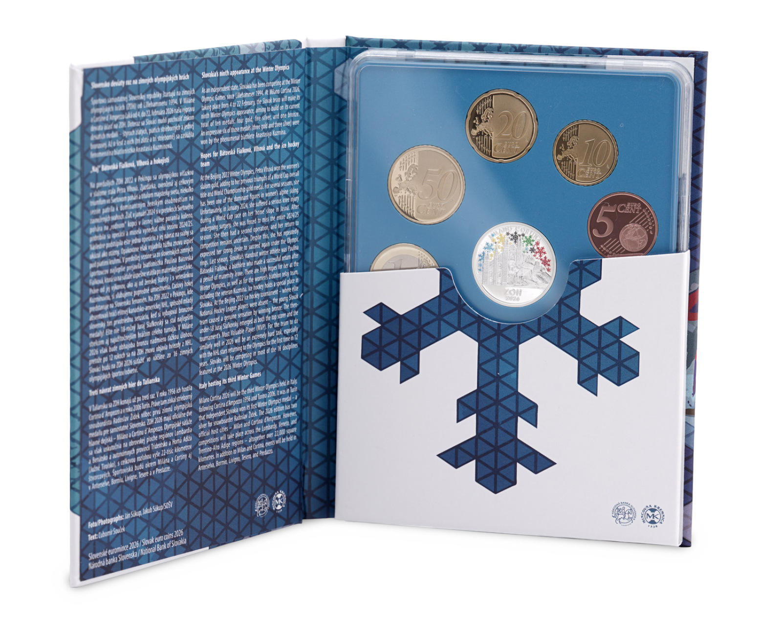 Súbor slovenských euromincí 2026 proof like v plexi obale vydaný pri príležitosti konania XXV. zimných olympijských hier Milano – Cortina d'Ampezzo.