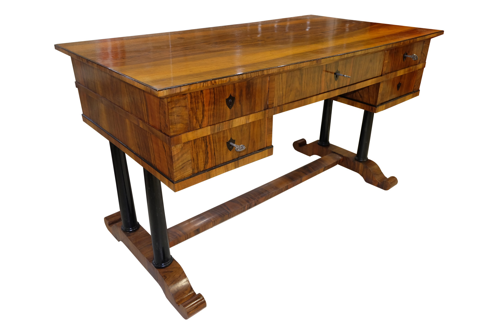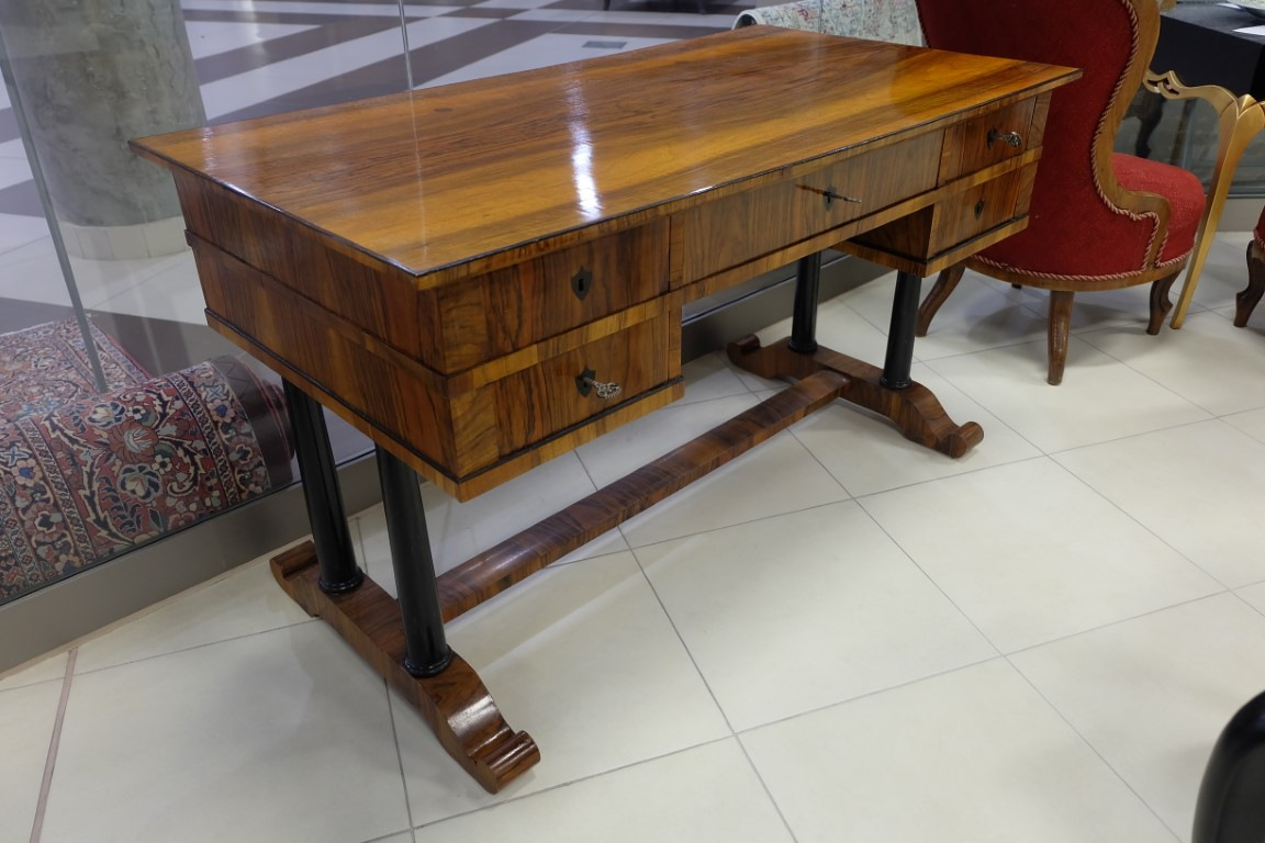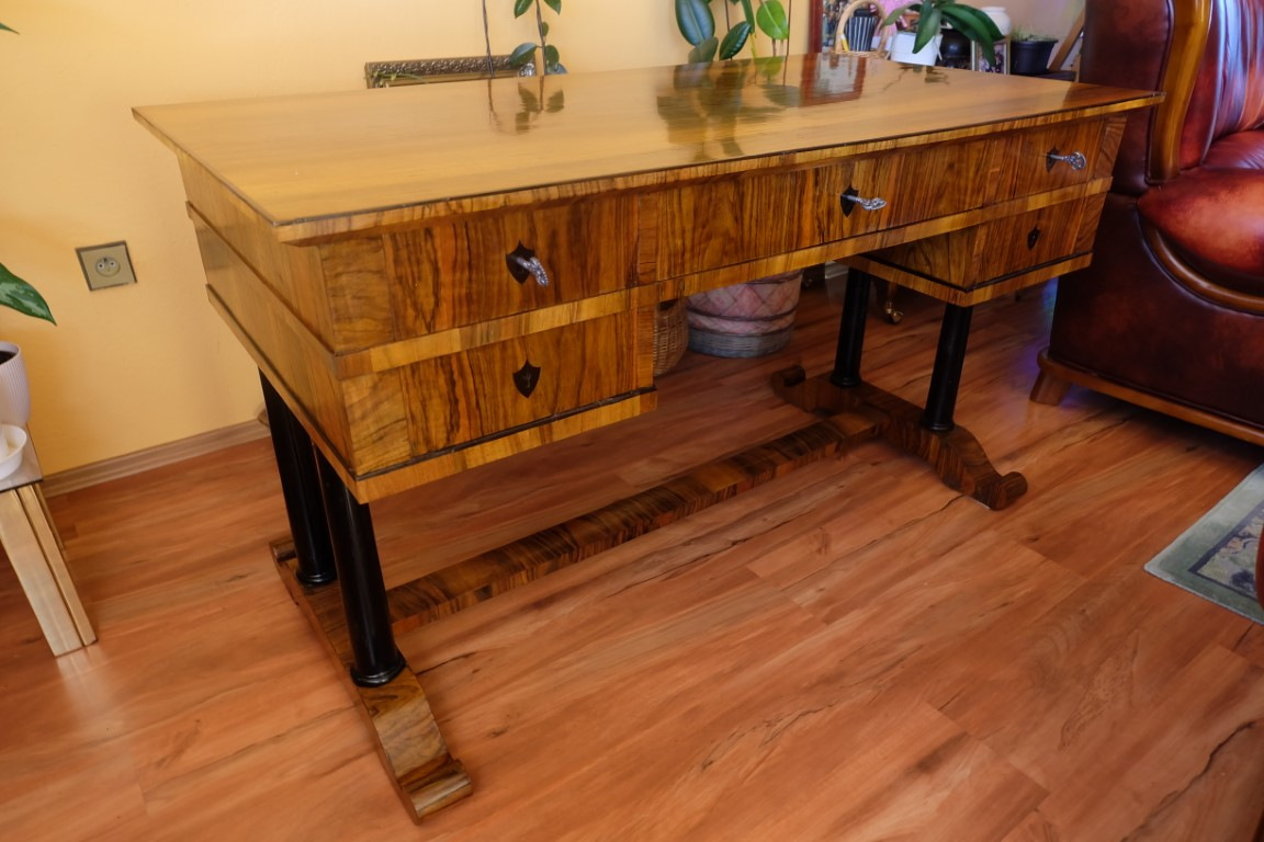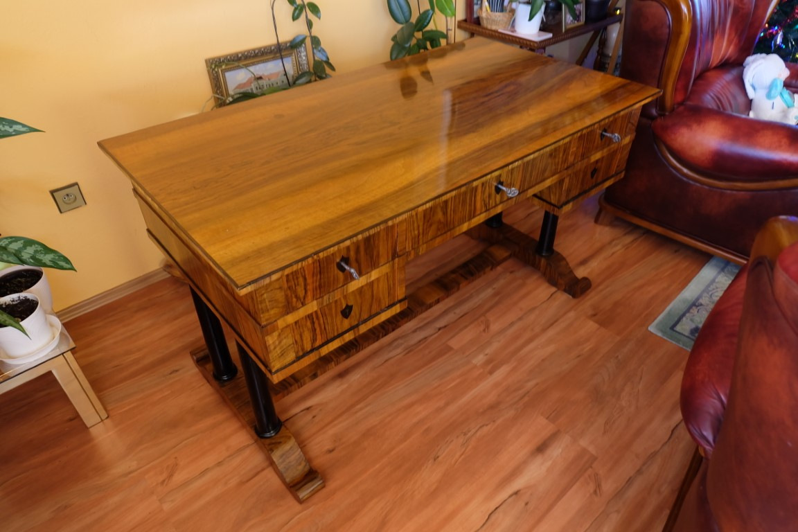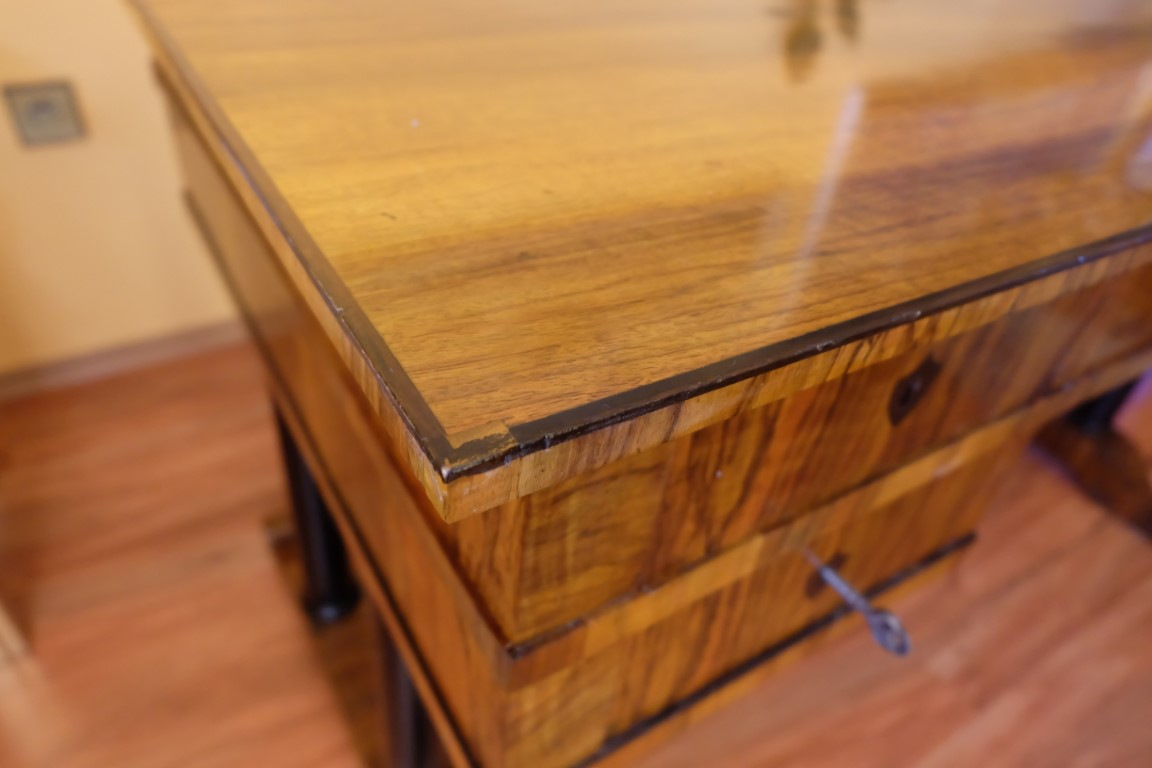 Zaujímavý a ojedinelí písací stôl s intarziou. Originálny pracovný stôl v biedermeier štýle. Krásna dyha. Stôl prešiel v roku 2026 kompletným a dôkladním reštaturovaním.