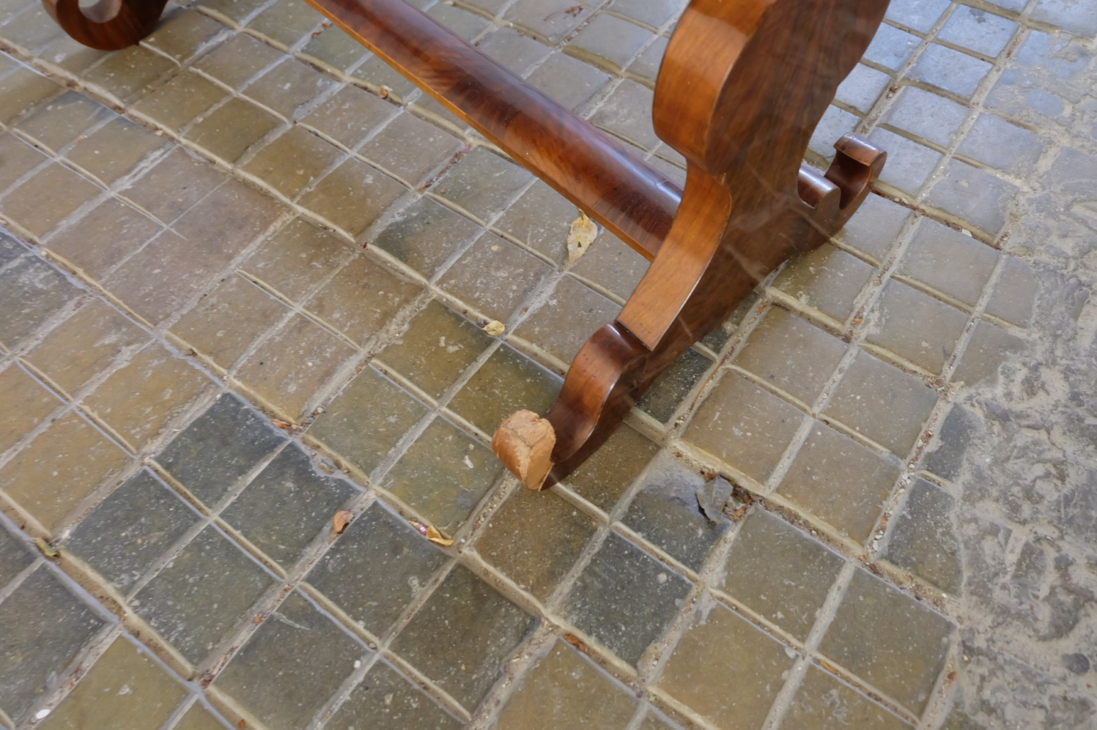 Orechové drevo, pôvodný stav. Koniec jednej nohy je jemne poškodený, viď foto. (kvoli tomu taká nízka cena)V roku 1999 prebehlo reštaurovanie. Stav je ale pôvodný, odporúčame reštaurovanie. V prípade záujmu Vám vieme reštaurovanie zabezpečiť.