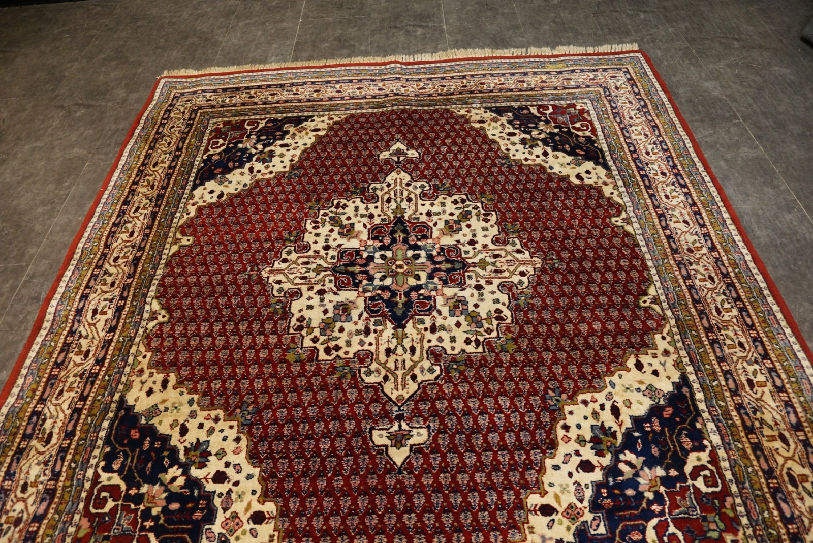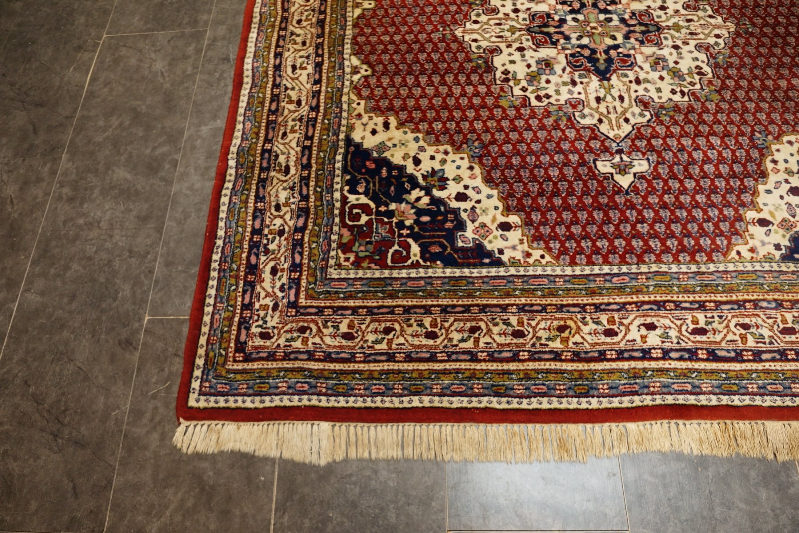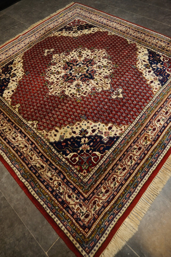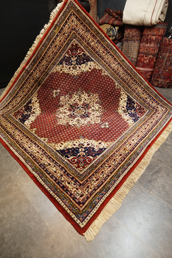 Štvorcový koberec Sarough Mir z Indie. Perszký vzor. Koberec je vo výbornej cene. Je to ale II trieda má špinavé strapce.