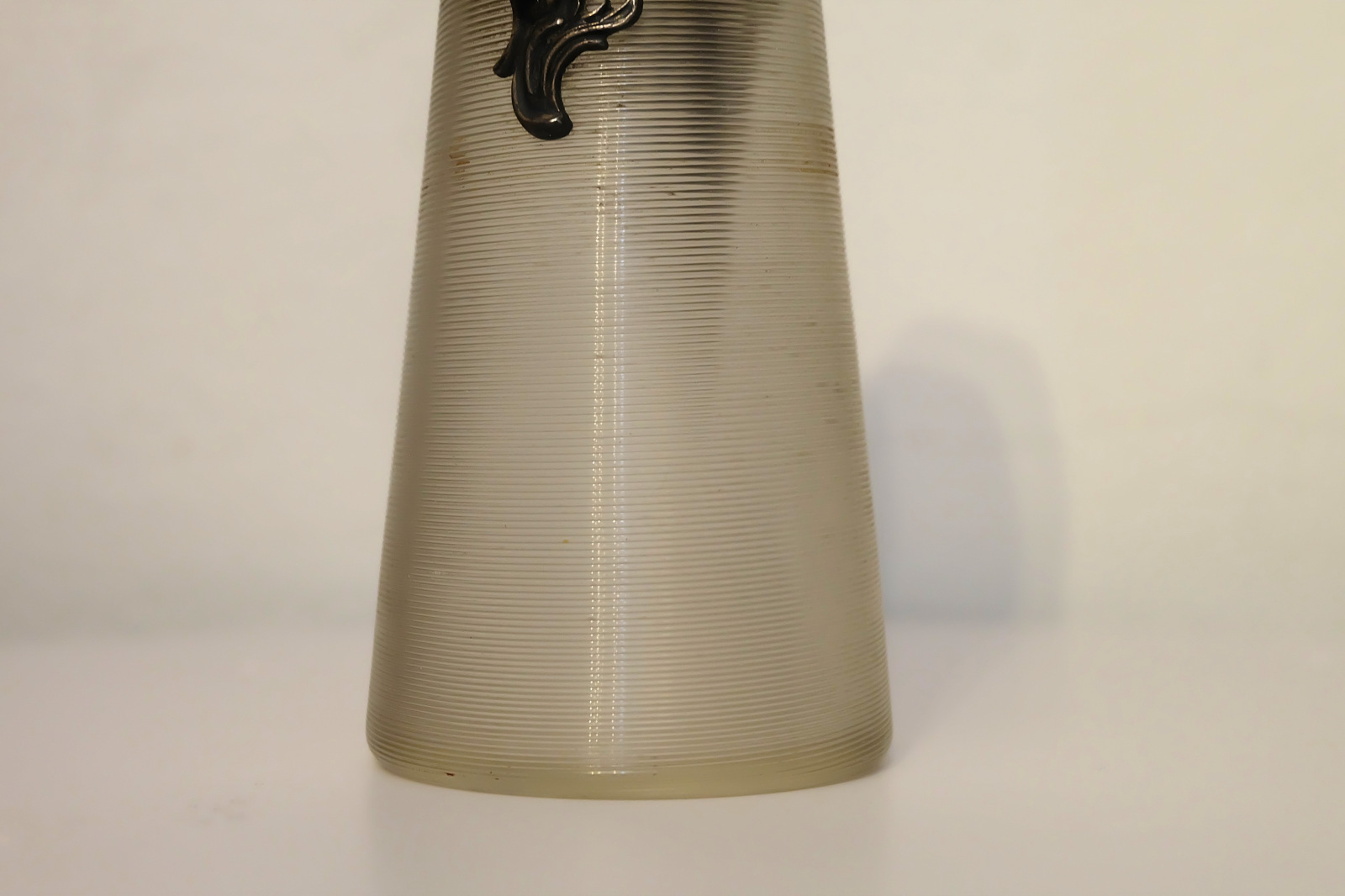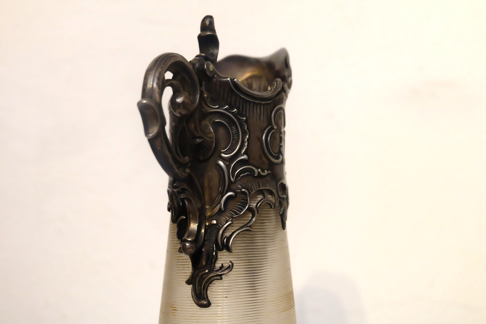 Secesný postriebrený džbán, bezfarebné sklo, rezaný dekor, kov.montáž s plast.vykrajovanými margarétkami, kov.secesné ucho, v. 26 cm